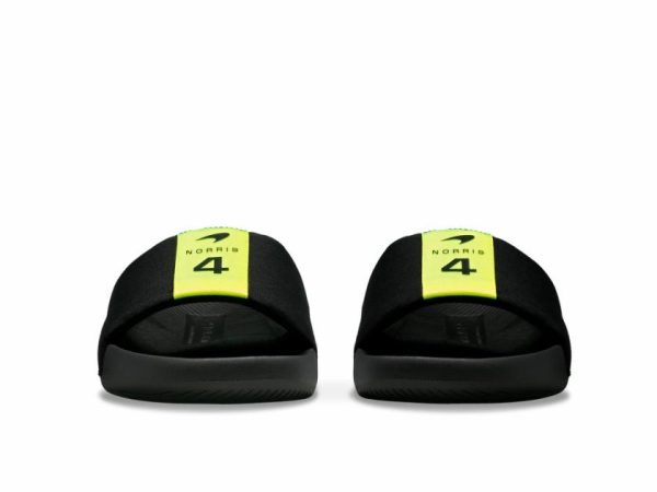 A classically styled and easy to wear Slide Sandal; delivering a soft and lightweight EVA footbed for a cushioned ride. The linear McLaren graphics on the footbed provide anti-slip grip and help expel water. The footbed shape is anatomically contoured to offer increased underfoot comfort, whilst the wide padded strap secures the foot in place. The strap features a signature debossed McLaren geometric graphic pattern and on top of this sits a premium webbing stripe, inspired by a drivers race harness. Branding includes Lando’s racecar number ‘4’ and ‘NORRIS’ – for the avid race-fan.